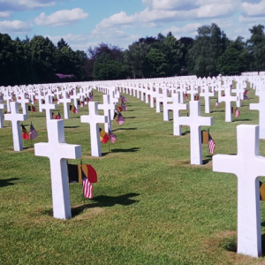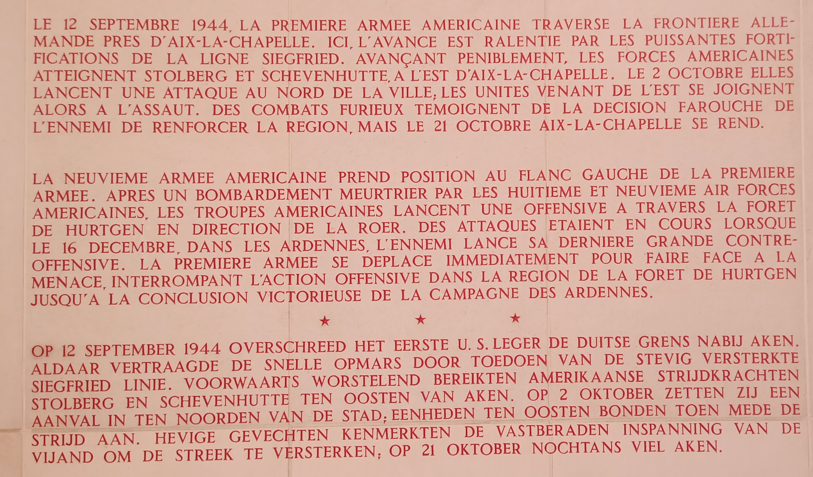 D'une superficie de 23 hectares, le cimetière américain d'Henri-Chapelle, en Belgique, abrite les restes de 7 992 soldats américains, dont la plupart ont perdu la vie pendant l'avancée des forces américaines en Allemagne. Leurs pierres tombales sont réparties selon de longues courbes sur une vaste pelouse légèrement en pente. Une large allée traverse le cimetière. À l'ouest, le site offre un excellent point de vue sur la campagne belge environnante, qui fut autrefois un champ de bataille.