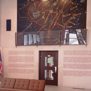 À l'est, une longue colonnade forme, avec la chapelle et la salle des cartes, le mémorial qui domine les sépultures. La chapelle est à la fois simple et joliment ornée. Quant à la salle des cartes, elle contient deux plaques de granite noir sur lesquelles sont gravées des opérations militaires, ainsi que des inscriptions rappelant les exploits des forces américaines. Sur les piliers rectangulaires de la colonnade, figurent les noms de 450 soldats portés disparus. Des rosaces ont été ajoutées pour signaler ceux qui ont été retrouvés et identifiés. Ce cimetière abrite les Américains de deux grandes campagnes : l'avancée de la 1re armée à travers le nord de la France, la Belgique, les Pays-Bas et le Luxembourg pour atteindre l'Allemagne (septembre 1944) ; et la bataille des Ardennes, contre-offensive allemande dans la région du même nom (de décembre 1944 à janvier 1945).