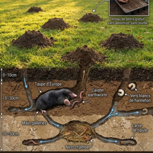 Les répulsifs à base de vibrations (bouteilles en plastique sur un piquet, appareils à ultrasons solaires) ont une efficacité variable — certaines taupes les ignorent, d'autres s'en éloignent temporairement. La seule méthode durablement efficace pour protéger une zone spécifique (un carré de semis, un massif de bulbes) est la barrière physique — un grillage à maille de 15 mm enterré à 40 cm de profondeur autour de la zone. La taupe contourne l'obstacle et continue son travail partout ailleurs — le jardin bénéficie de son réseau de drainage et le carré protégé reste intact.