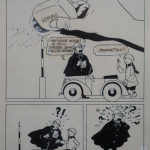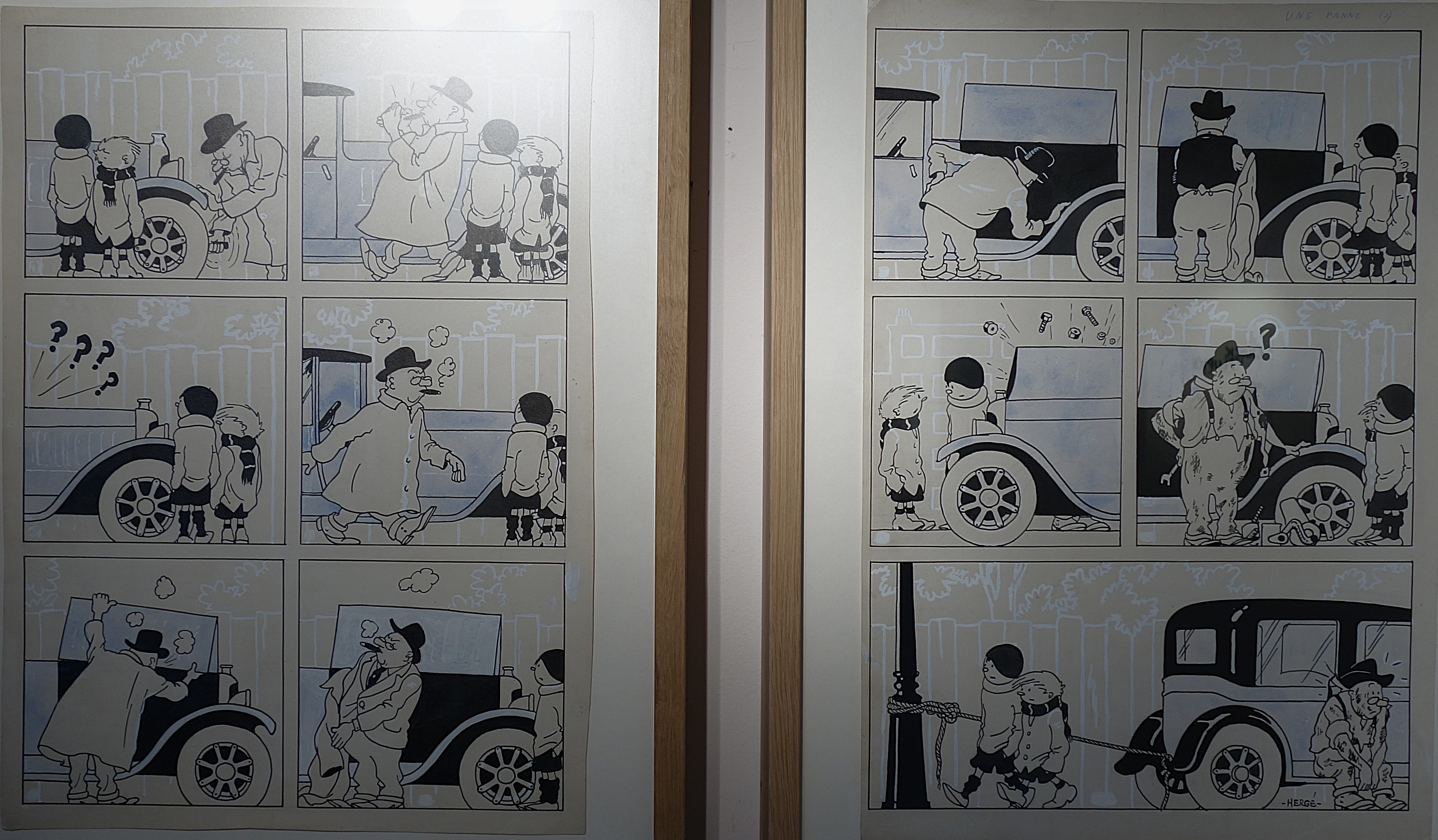 Alors que dans le première salle, nous trouvons différentes couvertures, avec des illustrations en format carré, du « Petit Vingtième » (1928-1940), avec la présence de « Quick et Flupke », dans la seconde salle, nous découvrons les planches originales de quelques gags, parfois surprenants, voire à la limite de l’absurde, comme celui où l’on voit un automobiliste ne parvenant pas à faire démarrer son véhicule. Ayant tombé la veste, sa chemise portant des traces de cambouis, pour vérifier l’état du moteur, il est désespéré, … alors que, tout simplement, le pare-choc arrière de sa voiture avait été attaché à un réverbère, par les deux « Gamins de Bruxelles » …