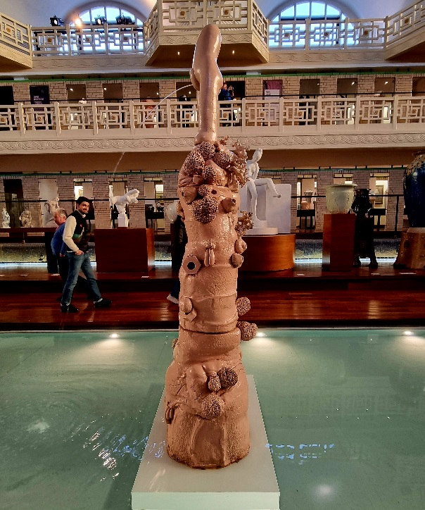 A noter que cette sculpture rose, créée en 2012, sobrement titrée « Fontaine », fut installée, à Paris, dans les bassins du « Jardin des Tuileries » . Clin d’œil à une oeuvre éponyme du plasticien français Marcel Duchamp (1887-1968), cette fontaine se caractérise par deux robustes piliers, en grès, constellés de coquillages, qui sont surmontés d’une frêle paire de jambes, ces dernières dévoilant un sexe féminin, dont jaillit, fièrement, un jet d’eau.