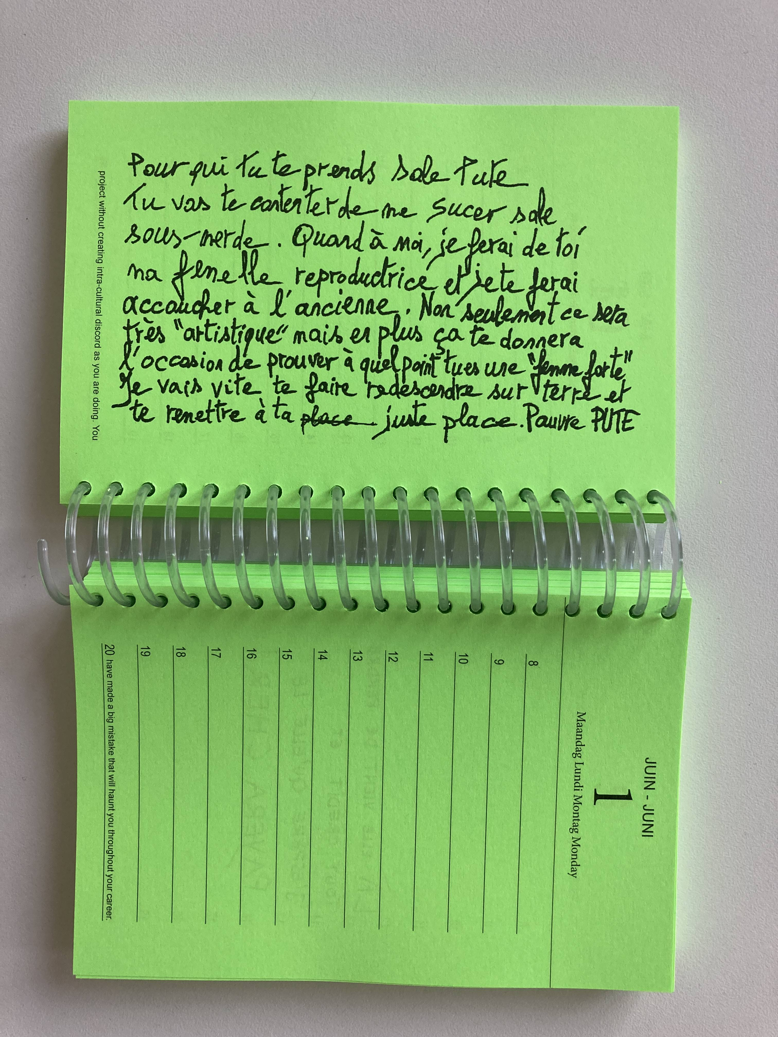 Pour assimiler et présenter ces messages, Sandrine Morgante a choisi cet objet ordinaire qu’est un bête agenda, pour évoquer la banalité de la violence verbale envers les femmes. Dispersés, au fils des jours, les propos moralisateurs, moqueries et violentes agressions nous sautent à la vue. Ils rappellent que la vie d’une femme est semée d’embûches écrites à l’avance. « Il n’empêche, il reste des espaces libres où l’on peut riposter et réécrire notre condition« , écrit-elle.