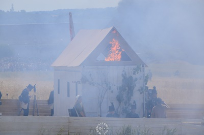 L'espace montra quasiment deux batailles en une, pour tout voir il fallait avoir accès aux multiples tribunes. Je me suis contenté d'une des deux batailles (Anglais contre Français tandis que l'autre couvrait le conflit entre Prussiens et Belgo-Hollandais contre Français) tout en pouvant observer une troisième au centre de l'immense plaine où l'on montra un bâtiment en feu (une ferme occupée par les Anglais, prise en partie par les Français avant d'être reprise définitivement par les Anglais).
