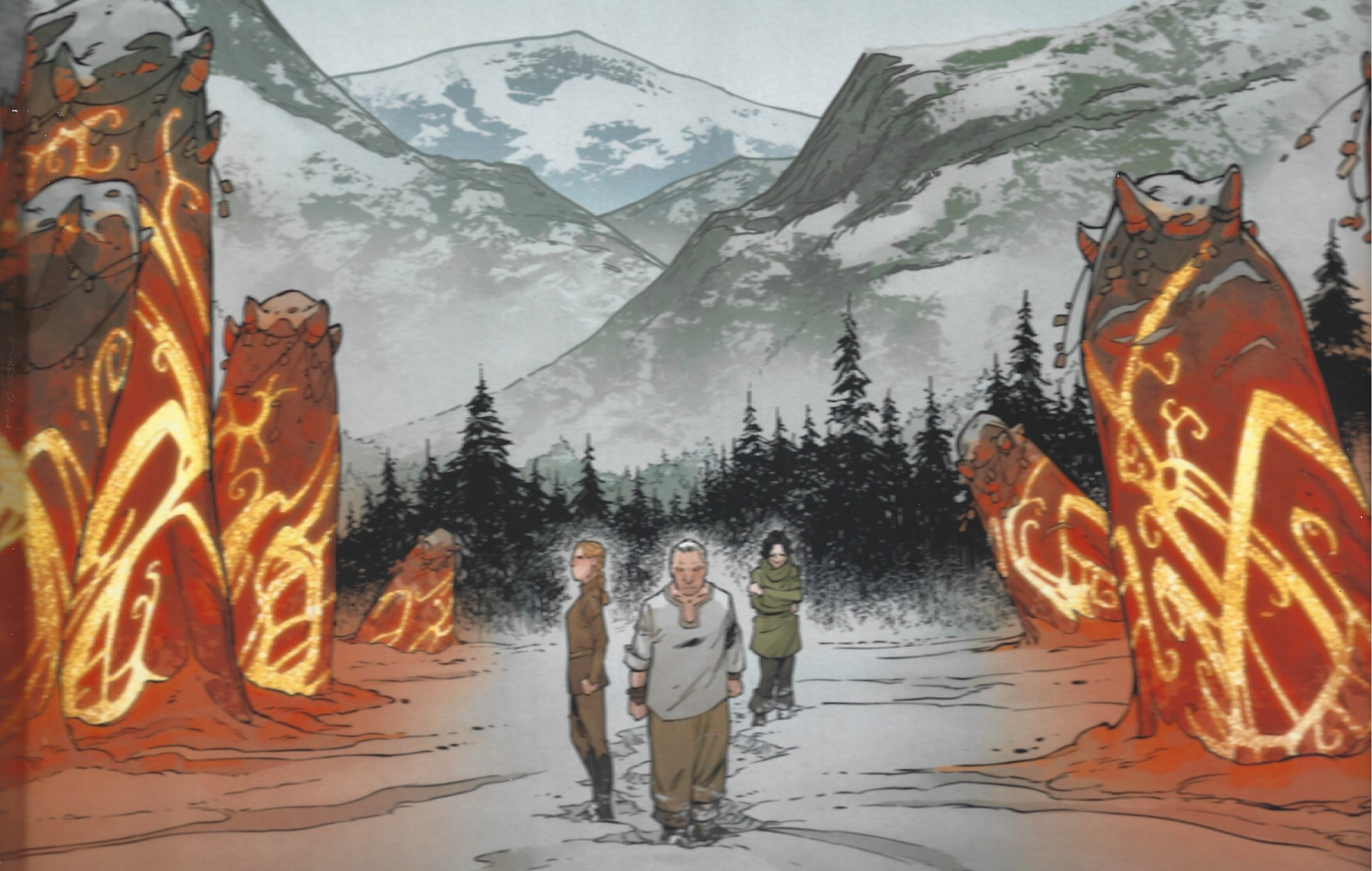 Sylvain Guinebaud, au dessin, impose un style semi-réaliste précis, tout en expressivité. Les personnages sont marqués, vivants, et les décors naturels dégagent une puissance évocatrice remarquable. Lou, à la colorisation, sublime l’univers graphique avec des teintes pensées pour chaque ambiance : bleu glacier pour la neige, ocres pour la chaleur du feu, verts doux pour les souvenirs. Ce jeu de contrastes accentue l’immersion et renforce l’impact émotionnel de chaque scène.