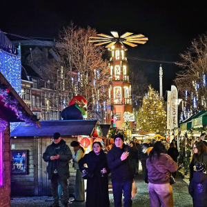 La Pyramide de Noël, tradition bien implantée dans les marchés de Noël germaniques, fait ainsi une apparition remarquée sur la Place du Marché, renforçant la tradition de Noël du Village et lui apportant une décoration spectaculaire et visible de loin… Les visiteurs affamés pourront y déguster des saucisses allemandes de type ‘currywurst’ ou des bretzels alsaciens, arrosés de vins chauds germaniques, de crémant d’Alsace ou de godets de schnaps.