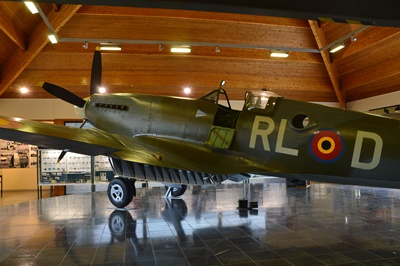 Le Spitfire XIV présenté ici est équipé d'une caméra « F-24 Vinten » pour les missions de reconnaissance. Cet avion a été commandé à la RAF en octobre 1943. Il a été utilisé par le 2nd Squadron (LASHAM) à partir de septembre 1944 puis par le 414th Squadron canadien jusqu'en septembre 1945. Le 13 août 1948, l'appareil appartenait au 161e Wing (nommé plus tard 2nd Wing), 352e Escadron belge. Après un entretien technique à Gosselies (près de Charleroi), il est transféré au 3e escadron belge du 2e escadron. Il fut mis hors service en novembre 1951. Il arriva à Florennes en 1955 et fut installé un an plus tard sans son équipement sur son piédestal au-dessus de la pelouse. Ensuite, le Monument au Spitfire a été construit. Toutes les pièces sont d'origine sauf les hélices qui ont dû être entièrement refaites. La matricule « RL-D » était pour Raymond Lallemant qui était le commandant de la base aérienne belge (Group Captain selon le classement de la RAF), son emblème de grade est mentionné de chaque côté du pare-brise et les damiers noirs et blancs forment l'identification du Wing, aujourd'hui ils identifient tous les avions de la base aérienne de Florennes.