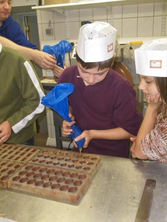 Après un petit film sur la provenance du cacao et la culture des cacaoyers, les chocolatiers en herbe se sont rendus dans l'atelier de fabrication, où ils se sont mis au travail.