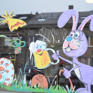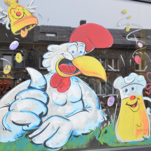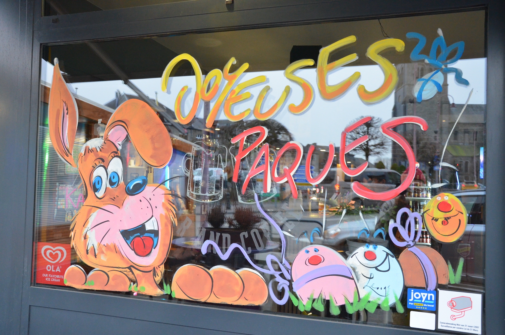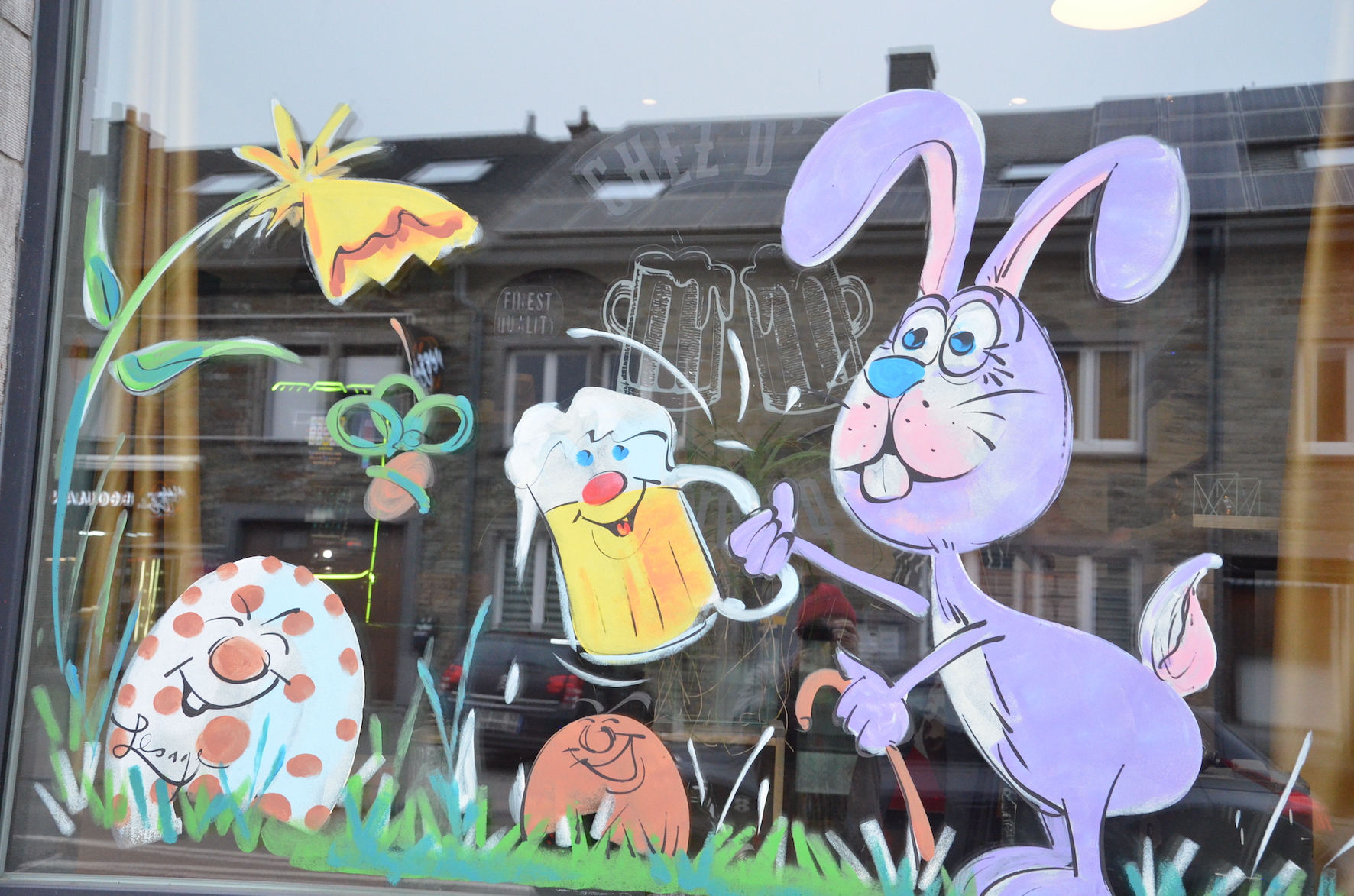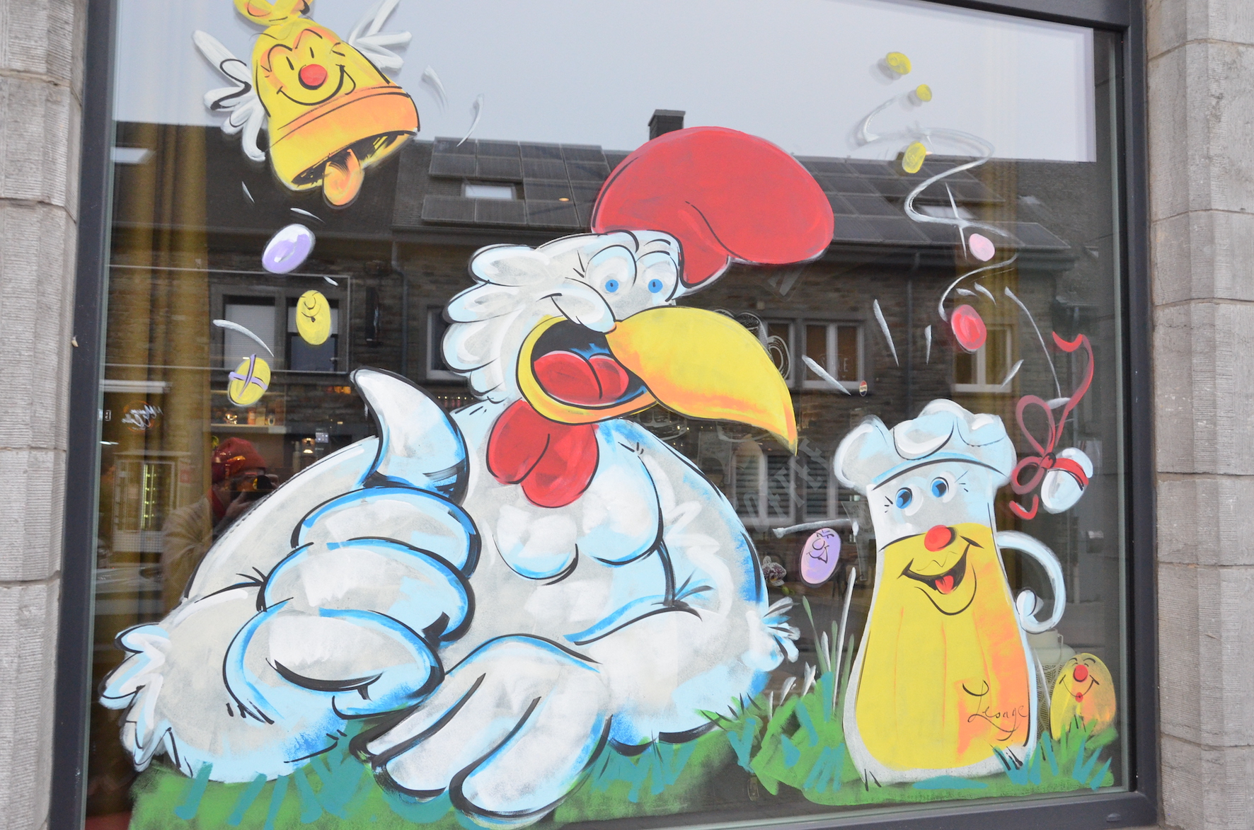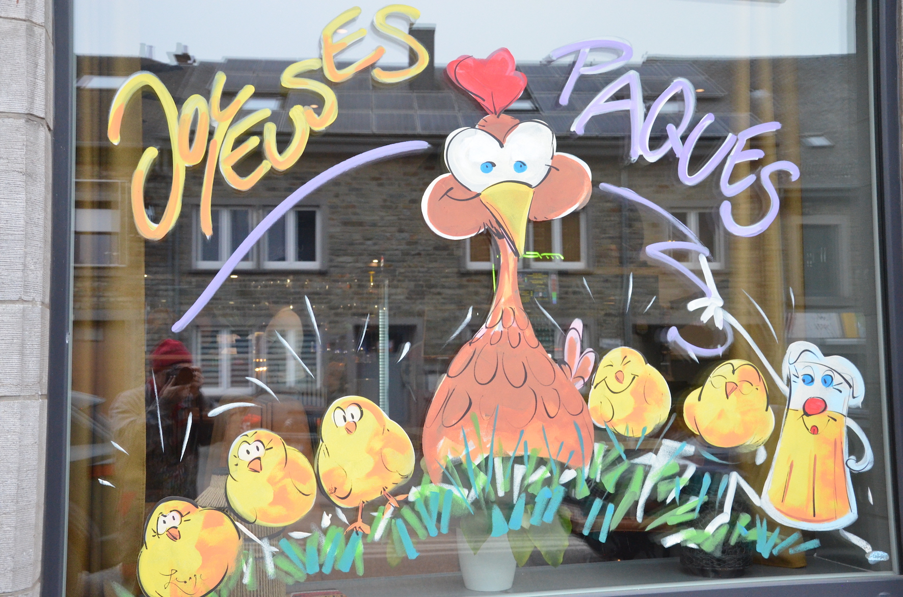 Pour la 50éme année l’artiste houffalois fait vivre des décorations de PAQUES sur les vitrines des commerçants. Jean-Marie Lesage un artiste peintre caricaturiste sur vitrine depuis 1968 9 E rue Fontenaille, B-6661 Mont-Houffalize Belgique tél 00 32 (0) 61 288 304 GSM .: 00 32 (0)477 90 63 94