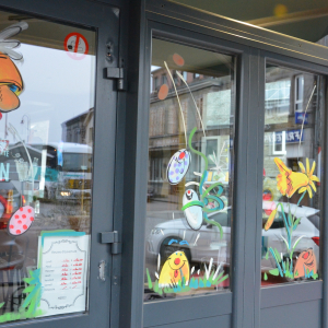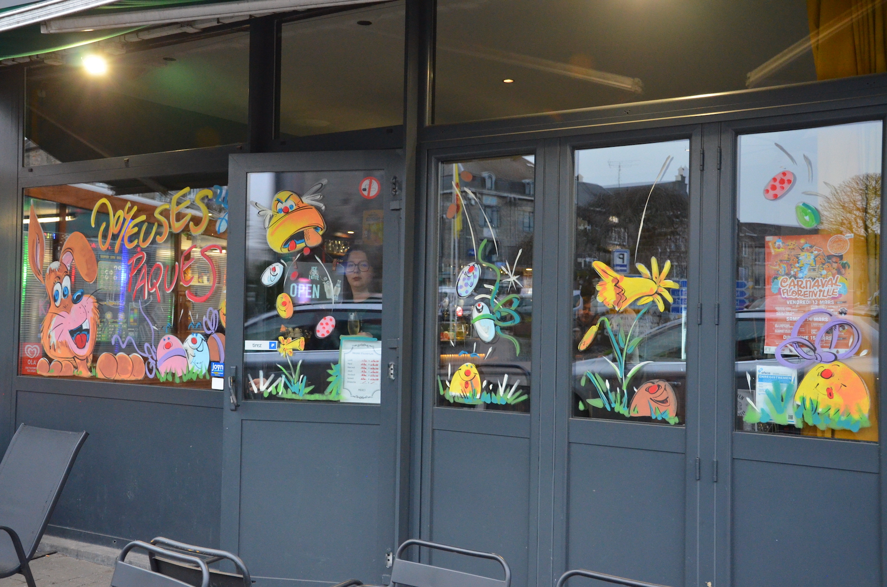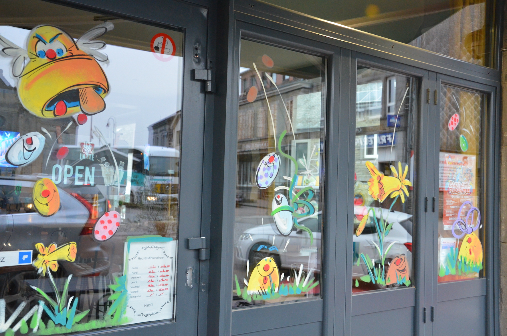 Peinture sur vitrines pour les fêtes de Pâques 2018.