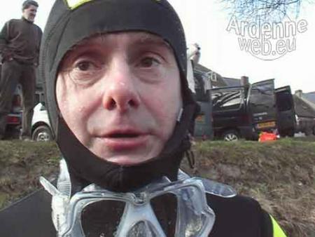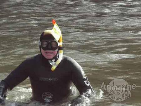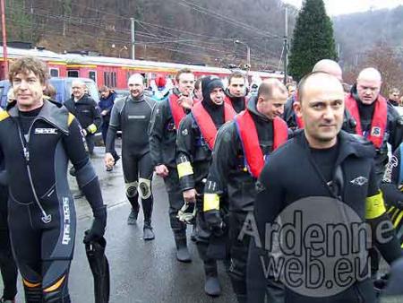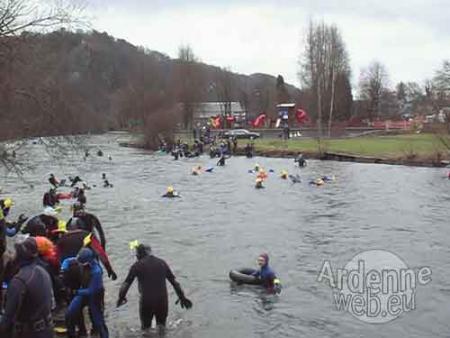 Er was zeer veel volk, ongeveer 500 mensen volgens de toeristische dienst. Het is een beetje zoals onze Nieuwjaarsduik, maar dan met duikpakken aan en een echte wedstrijd. Ze komen al in duikpak aan met de trein in Bomal, dan stappen ze naar de Ourthe. (dichtbij station)