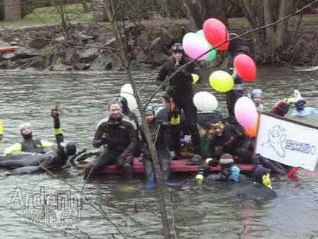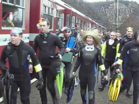 Ils sortent du train à Bomal en tenue de plongée et se dirigent vers l’Ourthe avec les palmes aux pieds. Une partie des participants se déguise pour le folklore.