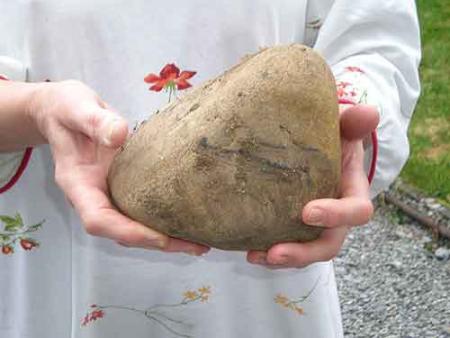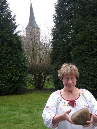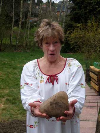 Ce jeudi premier avril vers une heure du matin, madame Benoît entendit un grand bruit dans son jardin, mais elle n’est pas descendue voir la cause de ce vacarme. Ce n’est qu’à son réveil qu’elle à vu une grosse pierre qui était tombée. Immédiatement, l’intéressée nous a appelés pour faire la photo. Madame Benoît est persuadée que cette météorite, qui pèse bien trois kilos, est venue du ciel attirée par la croix formée par les pavés qui divisent son potager et qu’elle vient d’installer hier. En cette période de Pâques, Madame Benoît y voit un message divin. A l’analyse plus en détail de l’objet, on observe la présence de fossiles d’animaux dont l’existence n’est pas connue sur terre !... Cela signifierait qu’il existe de la vie ailleurs. Le problème est très sérieux et à l’heure où vous lisez ces lignes, la propriété de Madame Benoît est encerclée par la gendarmerie, personne ne peut y pénétrer !... Le Saint-Siège, a dépêché un de ses évêques enquêteurs pour éclaircir ce mystère, car s’il y a de la vie sur une autre planète, il y a matière à évangélisation. Nous vous invitons à suivre l’événement dans nos prochaines éditions.