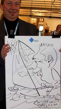 Pour offrir un souvenir original à ses visiteurs, MHZ s’est offert les services du dessinateur Jean-Marie Lesage, qui a ainsi croqué les portraits des clients et visiteurs de la firme tout au long de la journée. “Je fais une centaine de dessins par jour. Comme il ne faut pas que les clients posent trop longtemps, je dois dessiner assez vite. J’utilise donc un feutre au lieu du crayon et je dessine tout le monde de profil. J’ai déjà pas mal d’expérience en la matière d’évènements tels que celui-ci. Je travaille aussi à l’occasion de fêtes, de réceptions, etc.. Et jamais je ne me lasse des réactions de mes modèles.” Démontrant toute l’étendue de son talent, Jean-Marie Lesage a dressé un portrait très réussi d’Emmanuel Paquet, directeur de MHZ.