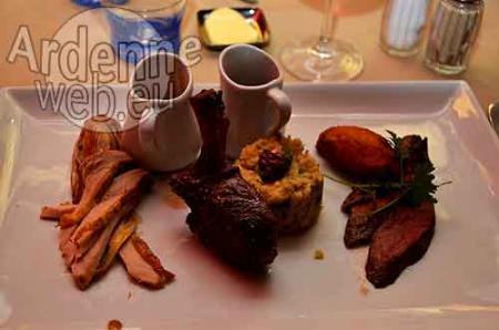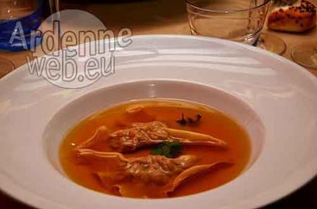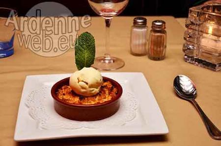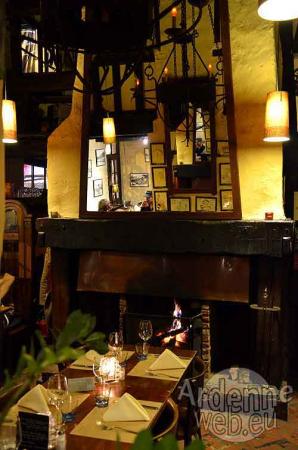 Dès l'entrée, l'histoire se met à parler. D'où vient donc cette taque en fonte dont les personnages nous sont inconnus, de même que les inscriptions du fronton ? Plus loin, un saint dans sa niche veille sur le bon aboutissement de nos appétits, tandis qu'en face de lui se dresse un personnage passablement impressionnant : Charlemagne? C'est fort possible. Mais à cette époque, tout le monde ressemblait à Charlemagne. La brique, et surtout le bois, sont les grands architectes d'un décor d'une amène rusticité. Les poutres sont dignes d'un Musée de la Vie Quotidienne. Deux pièces en enfilade, une mezzanine avec un vieux pupitre d'école, deux petites pièces d'un romantisme touchant, permettent à l'amateur d'opérer des choix avant de s'attabler, ou de prendre l'apéritif au bar aménagé au fond de la salle principale.