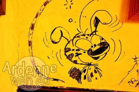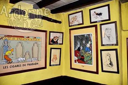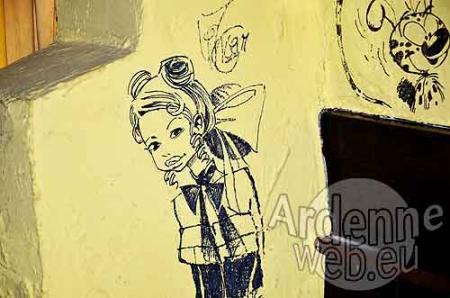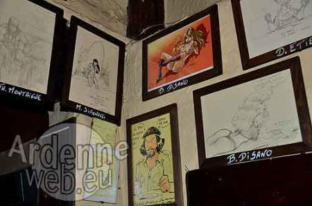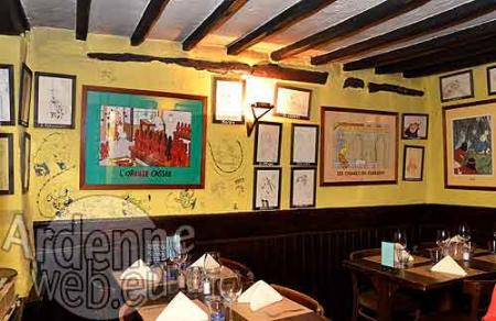Raison pour laquelle, un mur est couvert de dessins de Attanasio, Adam, Walthery ou Abdel. Un vieux piano avoisine une série d'agrandissements de cartes postales rappelant des souvenirs du Vieux Uccle : " Au Merlo café –restaurant", ou la "Laiterie de la Grande Ferme du Vivier d'Oie ". Au fil des salles, l'œil se trouve être accroché par des couvertures d'albums de Hergé ou une balance ancienne. Dans la petite salle aux murs rouges, une bibliothèque avec, pêle-mêle, des œuvres de Paul Chack, Dickens, Simenon ou Corneille. La chaleur de l'ensemble se maintient avec un dallage approprié et des tomettes séculaires et une superbe crémaillère d’époque venue de la maison de Marc Danval.