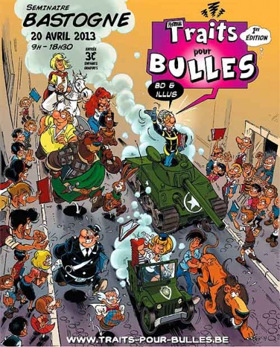 Les Jeunes Chambres Internationales (JCI) de Bastogne et de Centre Ardenne vous offraient la tenue du 1er Festival ‘Traits pour Bulles’, BD et illustrations, ce 20 avril 2013, au Séminaire, à Bastogne. Pour cette 1re édition, le Festival était axé vers la jeunesse et les enfants de part les artistes choisis et les animations proposées en prélude et pendant l’évènement. En effet, ce projet est l’occasion, pour la JCI, de lancer une opération de promotion de la lecture et du dessin auprès des plus jeunes. Ainsi, des concours sur ces thèmes seront proposés aux écoles de Bastogne pendant le mois de mars. Les lauréats étaient ensuite mis à l’honneur durant le Festival. De même, des ateliers didactiques furent réalisés par différents dessinateurs dans des classes du primaire et du secondaire ainsi qu’au service pédiatrique de l’hôpital de Libramont (Voir calendriers en annexe).