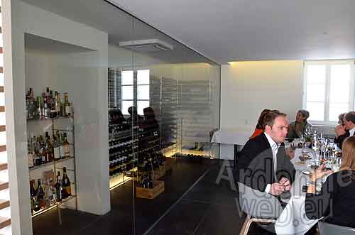 Plus loin, une troisième salle est juste séparée de la cave à vins par une paroi de verre sur toute sa profondeur. La quatrième salle se situe tout contre les cuisines. On pourrait presque dire qu’elle en fait partie, tout comme du jardin d’ailleurs. Un espace privilégié pour tout ressentir et vivre