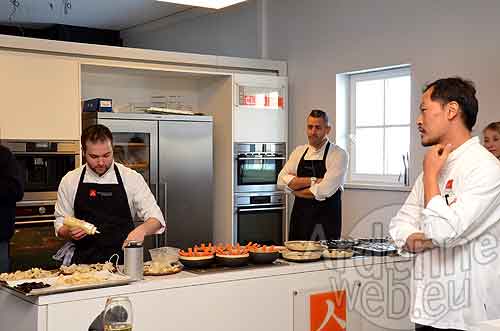 Son agencement : un îlot fixe autour duquel s’orchestrent six petits îlots mobiles. « Pour l’îlot fixe, nous avons choisi un équipement AEG performant mais expressément domestique afin de se rapprocher le plus possible des cuisines de domiciles privés » commente San.