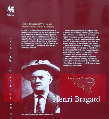 Henri Bragard:, né en 1877, a travaillé pour la résistance de Malmedy contre la germanisation forcée imposée sous le régime prussien. Il est co-fondateur du Clib wallon et ouvre des cours de français à la Fraternité en 1902. En 1905, il est membre de l’Assemblée wallonne, premier parlementaire officieux de la Wallonie. En 1914, il s’oppose à l’installation d’une garnison allemande à Malmedy avant la 1ère guerre mondiale au cours de laquelle il sera enrôlé de force dans les troupes impériales. A son retour, il militera pour la culture et l’identité wallonnes. Auteur et poète, il s’investit dans le folklore local. Il sera arrêté par la Gestapo en 1943 et mourra un an plus tard en déportation au camp de Sachsenhausen – Orianenburg.