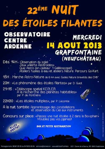 Le soir, des membres d’Astronomie Centre Ardenne vous raconteront le phénomène des étoiles filantes, la mission du télescope spatial KEPLER, chasseur de planètes habitables et enfin, les intéressantes Etoiles Multiples, liées entre elles par la gravitation.