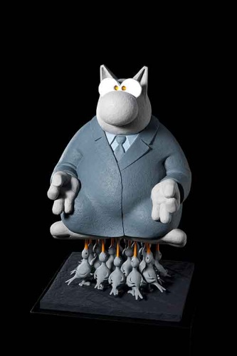 Il y a aussi les sculptures du Chat : « Passer de la 2ème à la 3ème dimension fut un exercice d’équilibre, une interprétation qui devait passer par les propres mains du créateur. Il fallait trouver le juste volume » dit Geluck. Un tout premier buste prit forme, en bronze, il y a 25 ans. En quelque sorte, l’ancêtre des sculptures à venir. Ce buste Chat fera l’objet d‘un tirage particulier pour l’exposition à la Galerie Liehrmann.