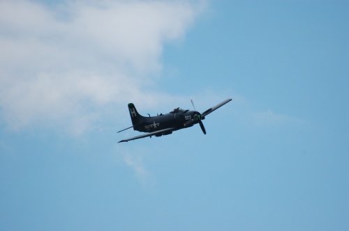 Le dimanche je n'ai vu que le Skyraider (1er vol en mars 1945 mais mis en service en 1950). Le Douglas A-1 Skyraider ou AD Skyraider fut le dernier bombardier d'appui tactique mono-moteur à pistons fabriqué au monde, il est sorti à l'époque où les premiers chasseurs à réaction entrèrent pleinement dans la partie.