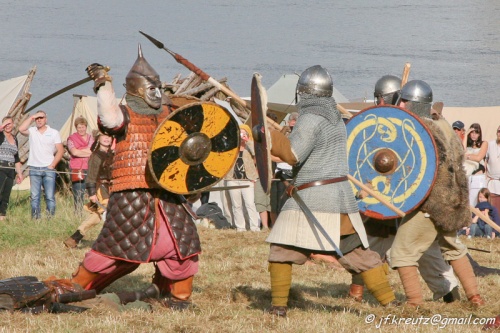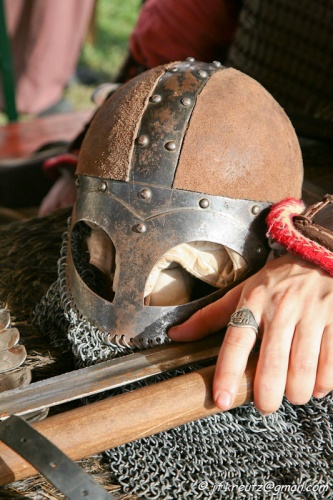 Il nous fallait donc trouver d’autres informations que les sources scripturales… Hormis la tapisserie de Bayeux, rien ne nous aide vraiment pour créer notre univers, excepté les nombreux ouvrages réalisés par Régis Boyer, référence francophone en matière d'histoire médiévale scandinave. Lors d’un campement, nous tentons de récréer au plus près les gestes d'antan. Même lors d'un imprévu, il est primordial pour nous de rester plausibles d'un point de vue historique. Nous tenons à ce que nos costumes représentent, avec rigueur, l’époque et les peuples ciblés (Vikings, Normands ou Varègues).