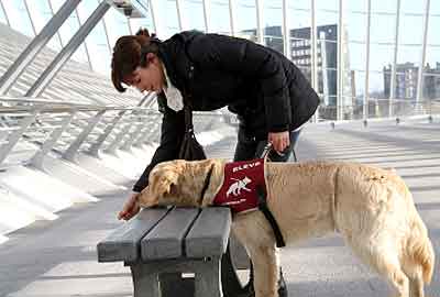 Le chien guide désigne les éléments demandés (passages pour piétons, sièges libres, escaliers, portes, boîtes aux lettres, comptoirs…).