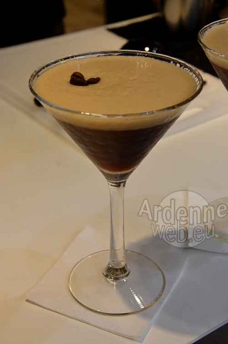 Gerard Meylaers faisant un cocktail à base de "Kiss From Belgium " au chocolat, de la vodka, du rhum et du sirop spicy cannelle Monin et du café "café Liégeois"
