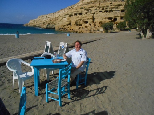 Une taverne à quelque 300 mètres, où les Crétois se retrouvent, Ligo Krassi Ligo Thalassa (Un peu de vin, un peu de la mer) avec des plats régionaux et toujours le petit verre de raki, alcool de raisin.