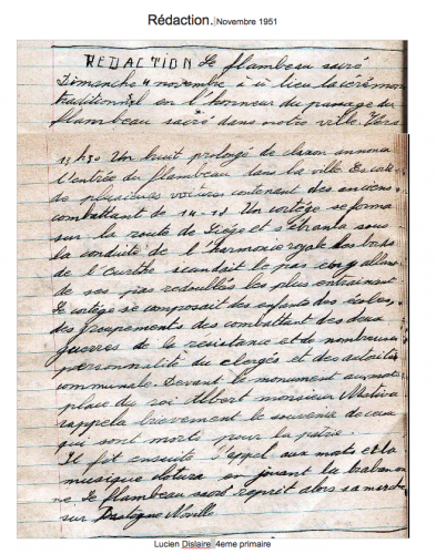 Toutes les classes de l’école, encadrées par leurs enseignants. Pour les garçons portant fièrement en sautoir  les couleurs nationales, messieurs Daulne, Lamy, Herman.La veille, dans le baraquement en bois servant d’école cour de l’Abbaye au bord de l’Ourthe, les instituteurs nous avaient rappelé les circonstances tragiques que nous avions vécus , nous enfants, la grandeur de notre pays, son héroïsme face à l’envahisseur et nous avions répété la brabançonne.