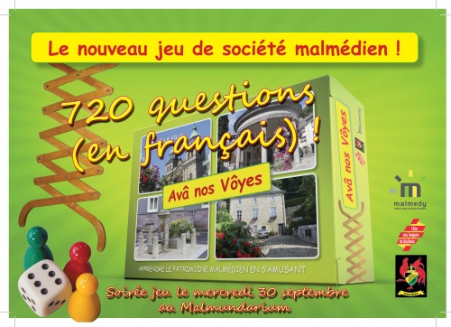 Avec 720 questions / réponses originales créées spécialement par le Royal Club Wallon sur Malmedy et sa région. De nombreux thèmes sont abordés : histoire, géographie, sciences et nature, art et littérature, folklore, sport, … Plusieurs modes de questions : Vrai / Faux, QCM, trouver les intrus, questions - gages, … De la culture, de l’humour et des anecdotes : des recherches et de l’amusement pour des soirées passionnées et passionnantes en famille et ente amis. Des règles aménagées pour des parties plus rapides. .. ou plus longues. Age recommandé : de 8 à 108 ans. Les questions sont calibrées de manière à plaire à tous. Nombre de joueurs : 2 ou plus, seul ou en équipes. Le cadeau idéal pour les fêtes ou les soirées de détente. Attention !! : édition limitée. Ne tardez pas à vous le procurer ! En souscription : 34 Euros jusqu’au 15 septembre 2015 sur le compte du Royal Club Wallon BE25 7925 2896 3482