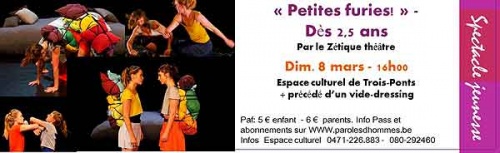 Ce spectacle sera précédé d’un vide-dressing organisé par l’association des Parents de l’école communale de Trois-Ponts. Profitez-en pour « rhabiller » vos enfants à petits prix et clôturer l’après-midi par un chouette spectacle en famille !