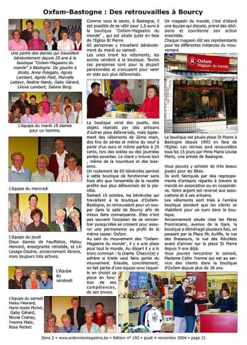 C’est un « monsieur très pressé » qui a donné l’envie à Yvonne Collin-Parmentier d’écrire le livre « 30 ans de bénévolat », en 2004. Ce monsieur très pressé n’était autre que Jean-Marie Lesage, qui avait la veille photographié un souper à Bourcy organisé par Oxfam, le magasin du Monde. Il a posé de nombreuses questions sur l’histoire de ce magasin à Yvonne.