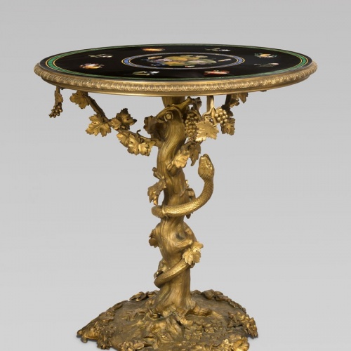 Suivant notreguide, Isabelle Graulich,diplômée en histoire de l’art, nous retrouvons, associé à Jeff Régis, au G10,Gerald Wathelet, animateur de plusieurs émissions, culinaires et autres, de la « RTBF », couturier, décorateur, ancien étudiant de la réputée « Ecole hôtelière de la Province de Namur » … Alors que leurs deux perroquets se font entendre, nous y admirons un splendide guéridon circulaire, en bronze doré et ciselé, avec plateau en marqueterie de marbre et de pierres dures, attribué à Giovanni Baptista Giorgi (1815-1851), décoré d’un serpent montant du socle vers le haut. Autre pièce de choix, un lit-canapé en acajou de Cuba, garni de deux Sphinx dorés, datant du début du 19ème siècle. Sur un côté, nous sommes attirés par le frémissement de l’eau s’écoulant d’une impressionnante fontaine (160 x 200 cm) en marbre blanc, du 18ème siècle, de style rocaille (époque Louis XIV), décorée d’un cygne et d’un putto (angelot).