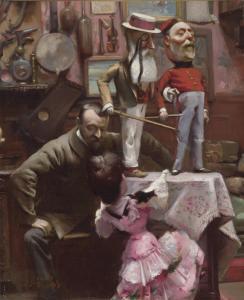 Egalement présente pour la première fois à « Antica Namur », la réputée Galerie« Berko Fine Paintings », sise à Knokke, depuis 1976, préparant donc, également, son40ème anniversaire, disposant, ici, de l’espace G18, où Viviane et Patrick Berko nous confient leur satisfaction quant au chaleureux accueil que leur réservent les Namurois. Parmi toute une gamme de peintures du 19ème siècle, nos hôtes attirent notre attention sur une oeuvre de Charles-Albert St.-Genois, « John Helwet et ses Marionnettes », mettant en scène, outre ce marionnettiste, les marionnettes des Rois Georges Vd’Angleterre et Léopold II de Belgique, qui, tous deux, dans leurs vraies vies, aimaient passer, ensemble, des soirées en galante compagnie, suggérée, ici, par une troisième marionnette, féminine quant à elle … En quelque sorte, une gentille approche caricaturale des excès de ces deux monarques …