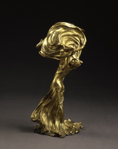 Chez Janssens Van der Maelen, auD14, nous trouvons une lampe de table de style Art Nouveau, représentant une célèbre danseuse du début du 20ème siècle, Loï Fuller (1862-1925), dont la carrière vient d’être portée à l’écran, sous le titre « La Danseuse » (Stéphanie di Gusto/Fra./2016/112′), l’héroïne ayant inventé l’épuisante « Danse des sept Voiles », ces voiles portés au-dessus de la tête ayant été fort bien sculptés, pour le plaisir de nos yeux, par Raoul Larche (1860-1912).