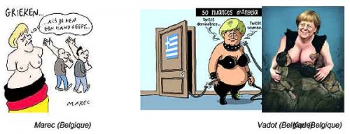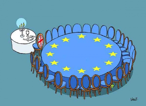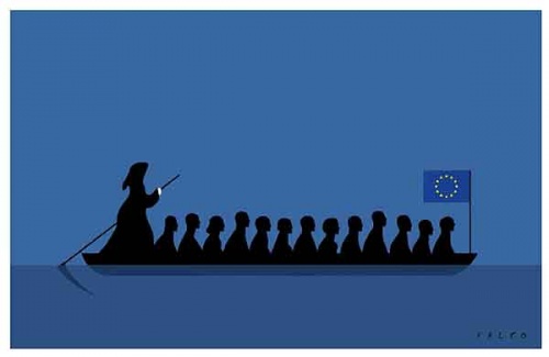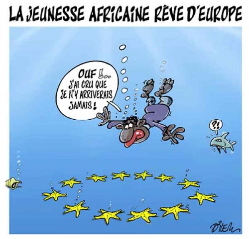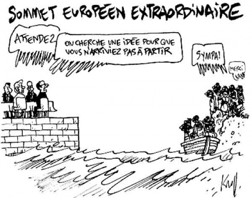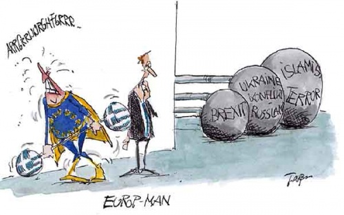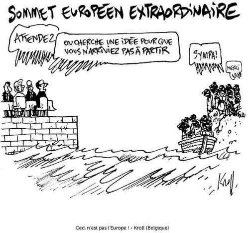 Fort bien présentée, découvrons donc la "dizaine de grands desseins desseins" évoquée par Nicolas Vadot: "Le Projet européen", "La Crise économique", "Une Europe allemande?", "La Crise des Réfugiés", "Les Mouvements indépendantistes", "Les Visages de l'Europhobie", "Brexit or not Brexit", "Sur les Rives du Bosphore", "Nos Voisins de l'Est" et "L'Europe vue par les autres", ... des sujets, le plus souvent, d'une brûlante actualité, tels, plus particulièrement, ceux évoquant le "Brexit" ou les réfugiés, tels que ressentis par Pierre Kroll, "Plantu" (Jean Plantureux) ou Nicolas Vadot, ... mais aussi par des dessinateurs inconnus chez nous, tels que ceux nous venant d'Algérie (Ali Dilem), d'Australie (Alain Moir), du Burkina Faso (Damien Glez), du Canada (André-Philippe Côté), de Chine (Xia Lichuan), de Cuba (Carlos Alejandro Chang Falco & Aristídes Hernández, ce dernier, signant "Ares", ayant remporté le "Prix de Caricature politique des Nations-Unies", en janvier 2016), des Etats-Unis (Liza Donnelly, Ed Hall & Jim Morin), d'Iran (Payam Borumand & Firoozeh Mozaffari), d'Israël (Avi Katz, Michel Kichka & Uri Fink), du Japon (Norio Yamanoi), du Mexique (Angel Boligan Corbo), de Palestine-Syrie (Hani Abbas) et de Tunisie (Nadia Khiari), sans oublier nombre de dessinateurs du continent européen, incluant la Russie (Mikhael Zlatkovsky) et la Turquie (Izel Rozental).