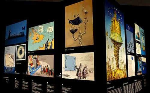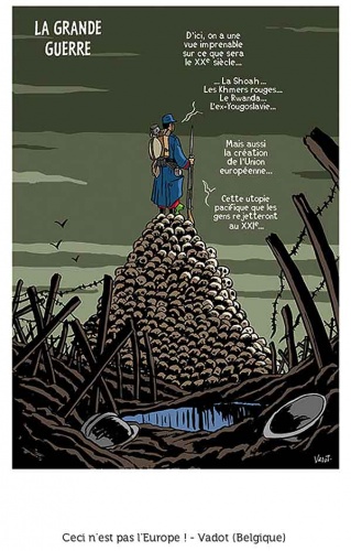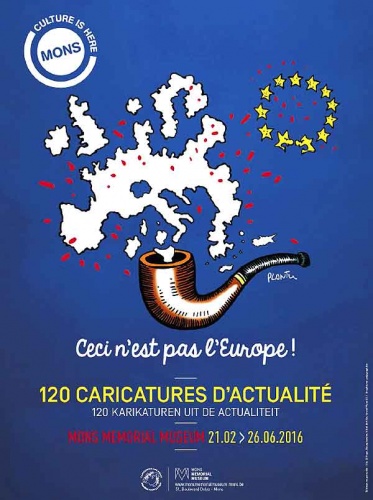 "A l'heure où l'Union européenne - cette construction pacifique unique dans l'histoire - se doit d'accueillir un afflux de réfugiés fuyant la pauvreté, la barbarie ou la guerre, , et alors qu'elle est elle-même en pleine crise identitaire, une centaine de petits dessins vont tenter de brosser une dizaine de grands desseins qui agitent le vieux continent... Révélateurs de l'imaginaire collectif, croyants ou athées, de gauche ou de droite, du Nord ou du Sud, 52 dessinateurs, venus de 29 pays du monde entier soulignent avec humour, tendresse, cruauté et parfois tout ça en même temps les aléas plus ou moins graves de ce maelstrom qu'est la construction européenne. Ils mettent aussi en garde. Mais toujours avec ironie, en utilisant un langage lié à l'enfance - le dessin - pour rappeler aux adultes que garder une part d'innocence est la plus grande preuve de maturité", écrit Nicolas Vadot, dans son "introduction" à l'exposition temporaire "Ceci n'est pas l'Europe - 120 Caricatures d'Actualité" (catalogue, p. 8).