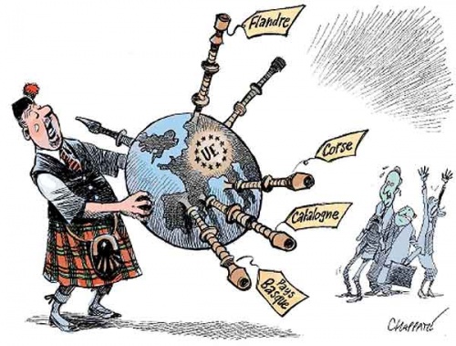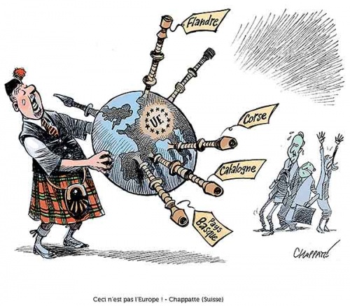 Proposée à notre découverte jusqu'au dimanche 26 juin, au "Mons Memorial Museum", voici une exposition à ne manquer sous aucun prétexte, présentée au sein d'un des nouveaux Musées montois, inauguré dans le cadre de "Mons 2015, Capitale européenne de la Culture". Ainsi, avec le Suisse Patrick Chappatte, un Ecossais évoque 3 autres régions en quête d'autonomie: Catalogne, Corse et Pays Basque. Nous en connaissons une autre, plus proche encore de nous!