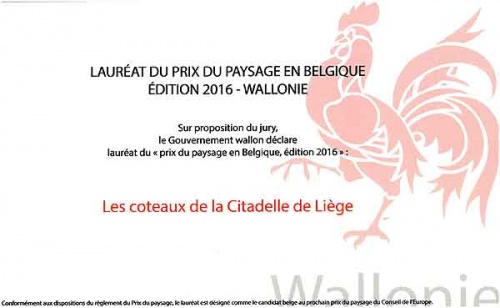 Ce 18 octobre 2016, à Namur, le projet des Coteaux de la Citadelle présenté par la Ville de Liège était proclamé lauréat de l’édition 2016 du Prix du Paysage en Belgique.