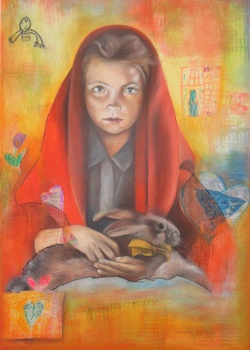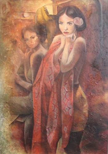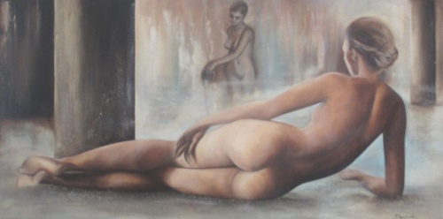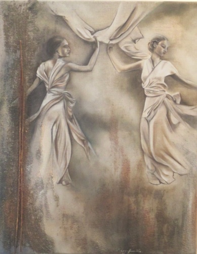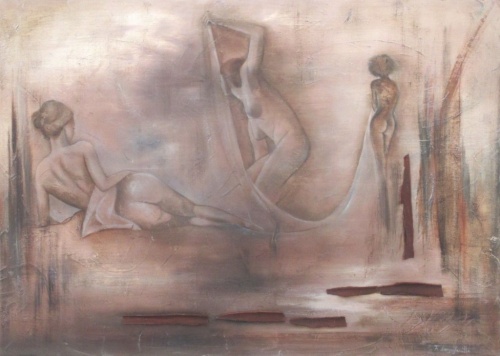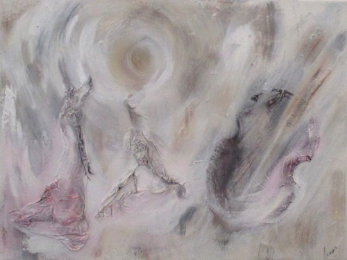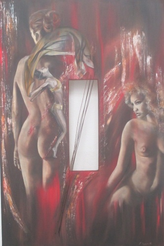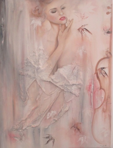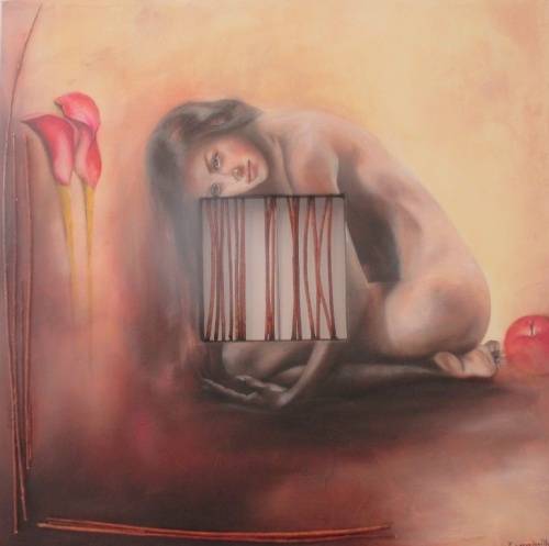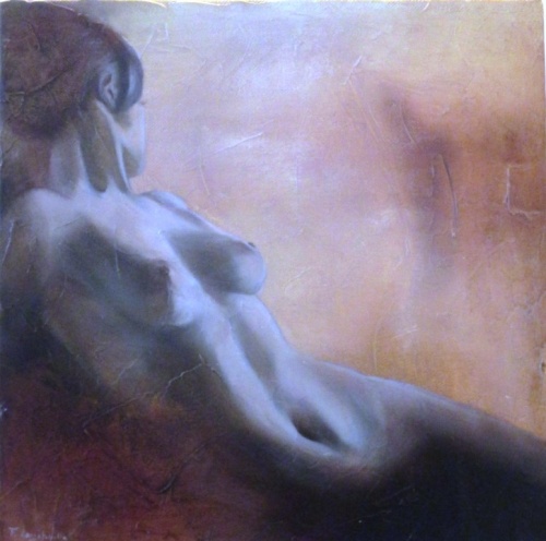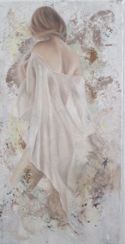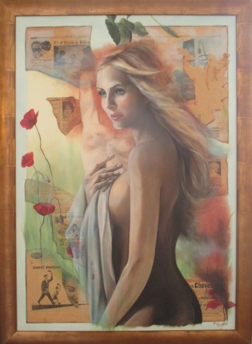 Fabienne Largefeuille s’aventure dans une série de techniques mixtes composées d’huile, de collage de sable, de crayon et de pastel. En effet, elle peint sur de vieilles cartes géographiques, partitions musicales ou de vieux journaux. Ainsi, elle varie les ambiances où nous retrouvons son personnage favori: la femme. Elle la représente délicate, sensuelle, aimante, et dans sa légèreté. Elle l’imagine, sans artifice, dans sa nudité.