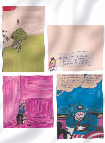 Jean scrute des albums achetés aux puces pour en extraire les cases qui lui plaisent. Il n’aime pas que ce soit trop dur à dessiner. Il choisit des choses simples «Ça je sais faire !» dit-il. Il va les reproduire en grand, A3 voir plus, sur des supports qu’il a sous la main et comme il semble vouloir avant tout remplir sa feuille en entier, il transforme la composition si nécessaire. L’aspect synthétique et bien structuré des cases est au final remplacé chez lui par une vision poétique et absurde de l’espace. Le savoir-faire laisse place au savoir-mal faire. Il produit une déconstruction expressive de la bande dessinée.