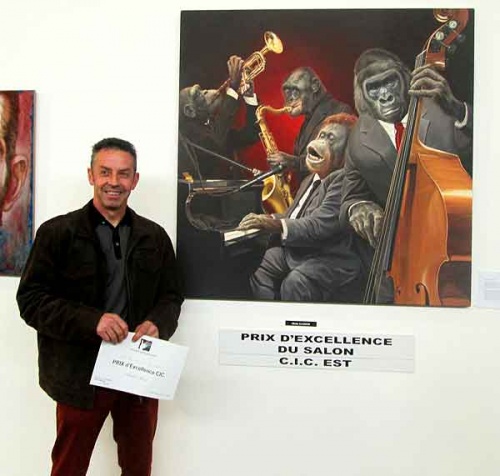 Le quartet de primates de Olivier Claudon a réussi son passage sur la "scène" du Salon des Artistes Lorrains, 123ème du nom. Le jury du salon a tenu à récompenser ce travail en attribuant le PRIX d'EXCELLENCE pour la toile à l'acrylique "Monkeys Jazz Band Quartet" d'Olivier Claudon.