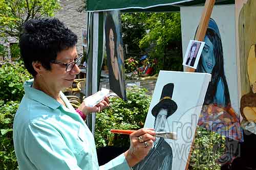 Les tableaux s’accrochent aux barrières et aux murets, les artisans s’appliquent à la tâche sous leur tonnelle.