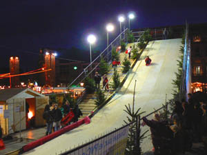 … Mais que ce départ ne nous empêche pas de fêter dignement Noël, découvrant ou retrouvant, la piste de luges, sise sur la dalle St.-Lambert (5€ l’utilisation, avec un nombre de descentes “à discrétion”), jouxtant le Châlet-Restaurant “Au Pied des Pistes”, ouvert par la Sation savoyarde de Châtel, qui fête, cette année, ses 70 ans d’exploitation touristique, permettant aux visiteurs du “Village de Noël” de goûter à d’onctueuses fondues savoyardes ou à d’excellentes raclettes garnies, arrosées de bons vins du pays, “Apremont” , “Roussette”, ou autres…