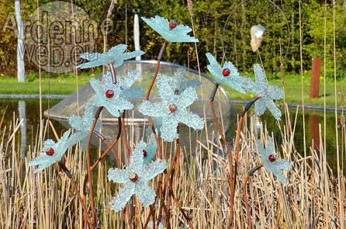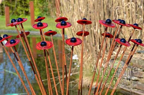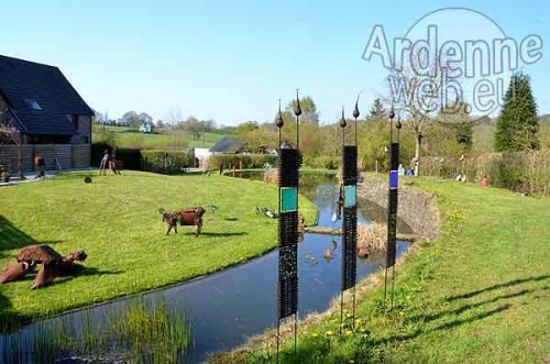 A la belle saison, le plaisir est certain de voir une salle d’exposition s’installer au jardin et s’ouvrir au grand air. Ici, la chorégraphie se construit aux détours de haies vives, s’épanouit dans une clairière, chemine aux alentours de l’étang, révèle un inattendu petit bois. Nul éclairage halogène mais la lumière du jour qui, de l’aube au crépuscule, racontera l’œuvre à sa manière, la faisant vivre bien au-delà des mains de l’artiste. C’est l’évidence que révèle l’exposition PAS à PAS à Louveigné : entre art et jardin, les échanges sont multiples, riches d’émotions très personnelles.