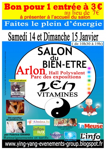 Ce salon organisé depuis de nombreuses années en Belgique, France et Suisse romande, est un lieu unique pour rencontrer et découvrir les acteurs du bien être au sens le plus large du terme (thérapies, développement personnel, connaissance de soi, santé – forme – beauté – hygiène – bien être au naturel, médecines traditionnelles chinoises, produits bio, produits du terroir, géobiologie, radiesthésie, habitat sain, feng-shui, art, artisanat, …) tels sont les sujets proposés par le salon « ZEN VITAMINES ».