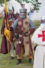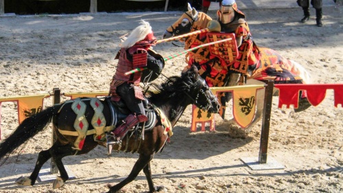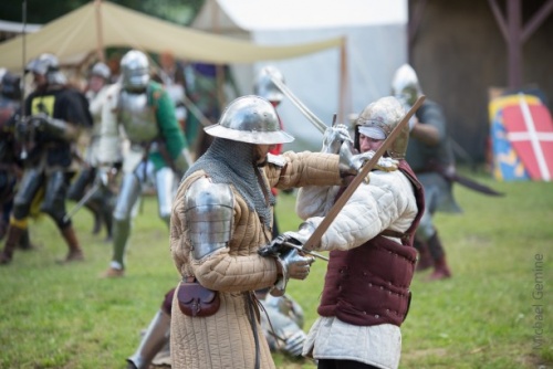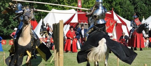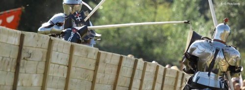 .. Et, tous réunis, pour terminer en beauté notre visite aux "Médiévales", rendons-nous, à nouveau, au "Bourg", pour assister, à 19h45, à la représentation de "La Mélée" (également proposée à 11h15, 13h15, 15h15 et 18h15) offerte par les "Ecuyers de l'Histoire", avec des chevaliers qui doivent, à l’aide d’un bâton de bois, frapper au galop leurs adversaires, tous en armures et en bannières.