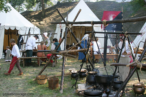 Mais, utilisant au mieux ce lieu, intitulé "Bourg", la "Compagnie de la Licorne" a recréer l'ambiance de la vie quotidienne d'un village du Moyen-Age, avec la collaboration de quatre autres compagnies de recontitutions. Ainsi, nous pourrons montrer à nos enfants comment, à l'époque, l'on écrivait en calligraphie, l'on se soignait et l'on frappait la monnaie, différentes tentes d'un campement médiéval nous présentant, de l'alchimie, de l'artillerie, de la maroquinerie, de la tapisserie, de la vannerie, ..., une forge étant, même, reconstituée...